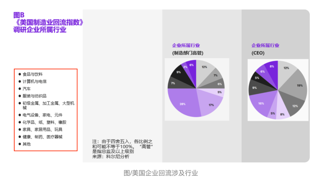 注意,是對所有行業調研后,有超過80%的企業都計劃回流或者正在回流美國。 這些行業,不僅僅全是高端產業,也包括一些所謂的“低端產業”,比如食品與飲料、服裝與紡織品、家具、玩具等等。 傳統產業關乎安全 很多人眼中的“低端產業”,就是面向大眾消費的制造業,比如紡織業、服裝、皮革、家具等等。
