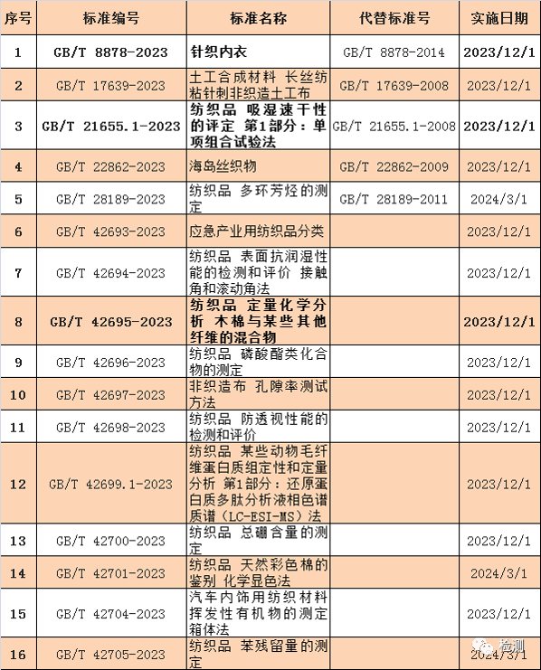 紡織服裝領域多項國家標準發布,如GB/T 8878-2023《針織內衣》、GB/T 21655.1-2023《紡織品 吸濕速干性的評定 第1部分:單項組合法》、GB/T 42695-2023《紡織品 定量化學分析 木棉與某些其他纖維的混合物》、GB/T 42698-2023《紡織品 防透視性能的檢測和評價》等。 部分標準目錄如下: